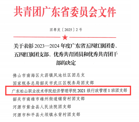 近期,广东省“两优两红”名单揭晓,我校2021级行政管理1班团支部获广东省五四红旗团支部荣誉称号。