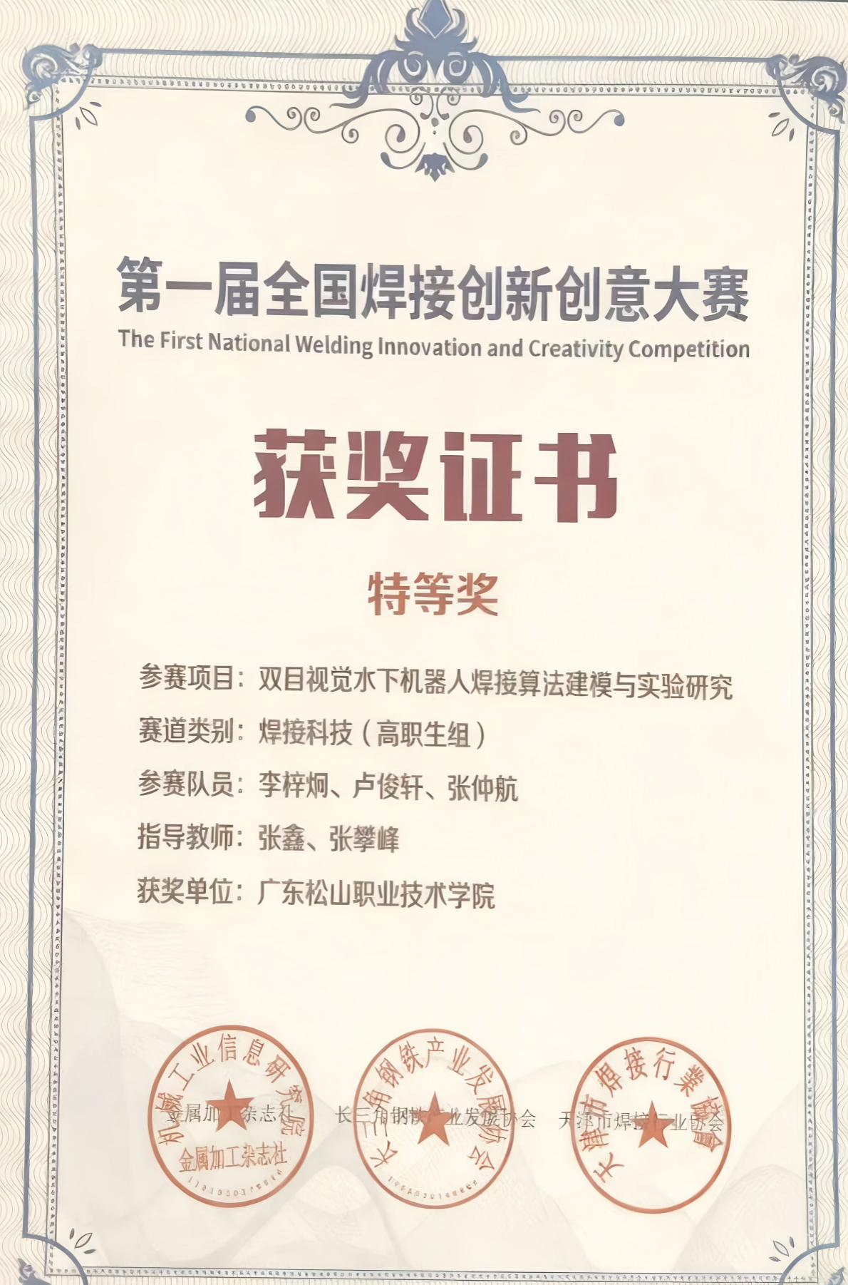 11月21日,“沪工杯”第一届全国焊接创新创意大赛颁奖典礼在天津盛大举行,学校先进制造学院团队凭借“双目视觉水下机器人焊接算法建模与实验研究”项目,斩获焊接科技赛道高职生组“特等奖”,成为本届大赛高职组别唯一获此殊荣的团队(参赛学生:李梓炯、卢俊轩、张仲航;指导老师:张鑫、张攀峰)。赛后,团队核心成员受邀参与第三届智能化焊接工艺创新(金桥焊材)论坛暨第六届天津焊接论坛,在焊接领域持续释放创新活力。